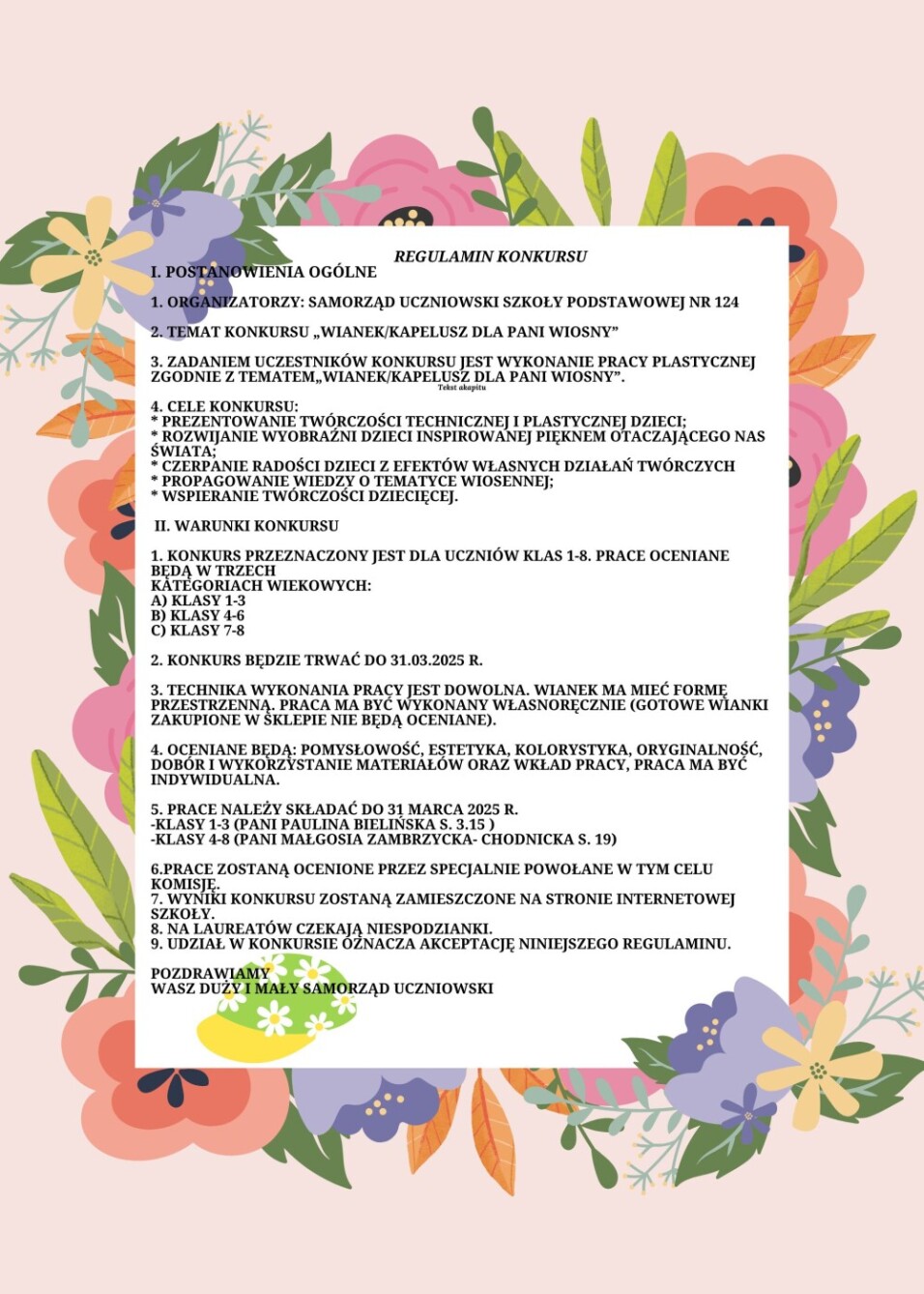 Duży i Mały Samorząd Uczniowski zapraszają uczniów klas 1-8 do wzięcia udziału w konkursie plastyczno-technicznym "Kapelusz pani Wiosny". Konkurs trwa do 31 marca. Szczegóły znajdziecie na plakacie.