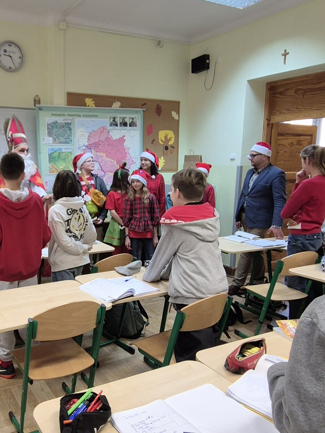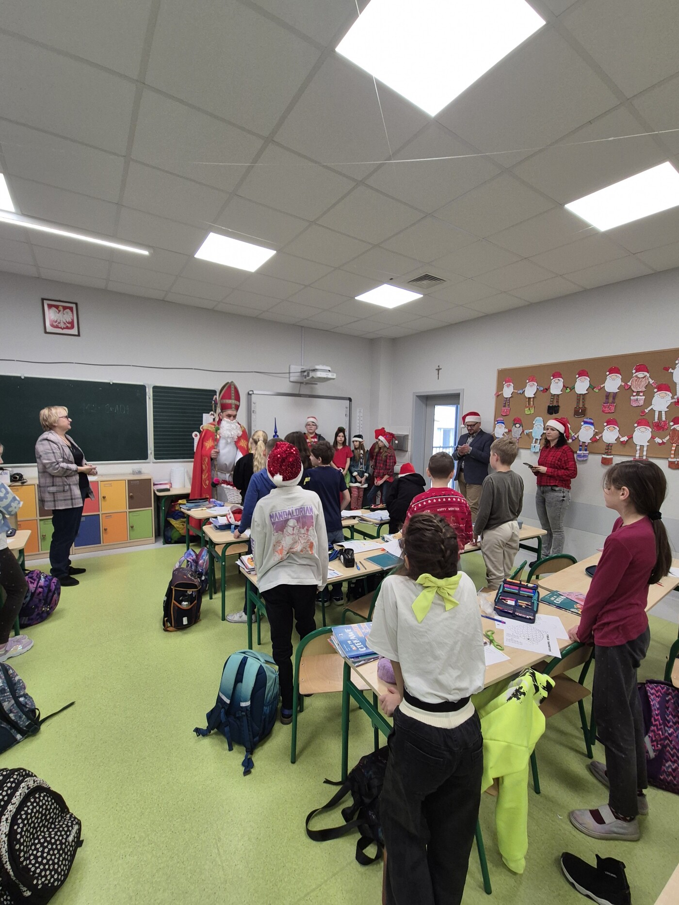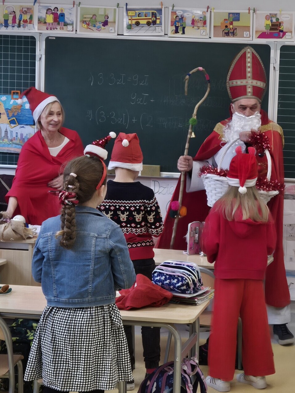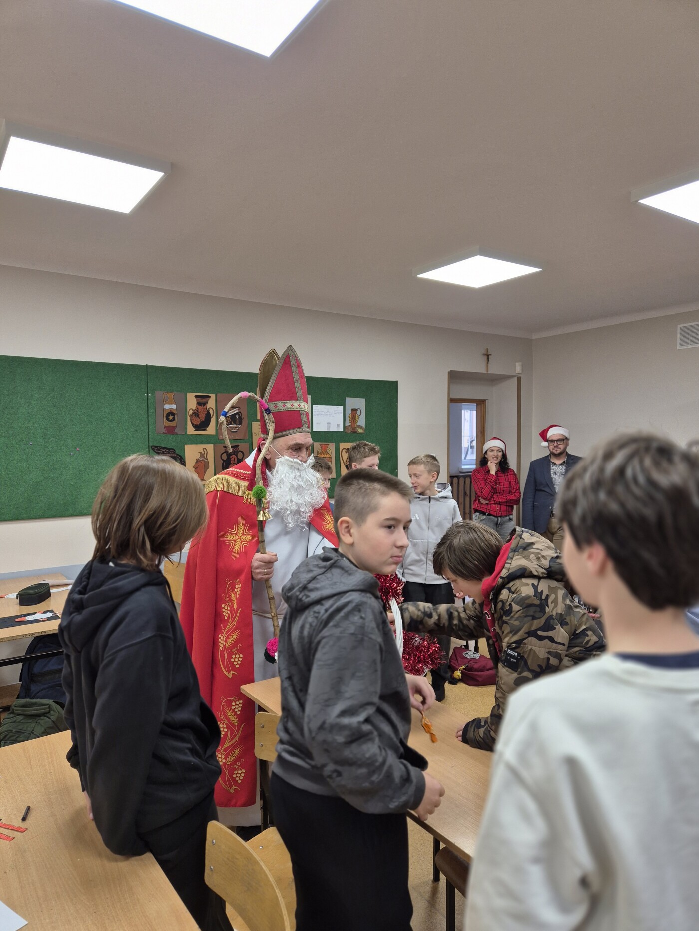 Mikołaj, niosąc ze sobą koszyk pełen słodkości, odwiedzał kolejno wszystkie klasy. Wchodził do pięknie udekorowanych sal, w których panował świąteczny nastrój, a dzieci z radością witały gościa. Każdy uczeń został poczęstowany cukierkiem, a następnie wszystkim złożono serdeczne życzenia wszelkiej pomyślności z okazji zbliżających się Świąt Bożego Narodzenia.