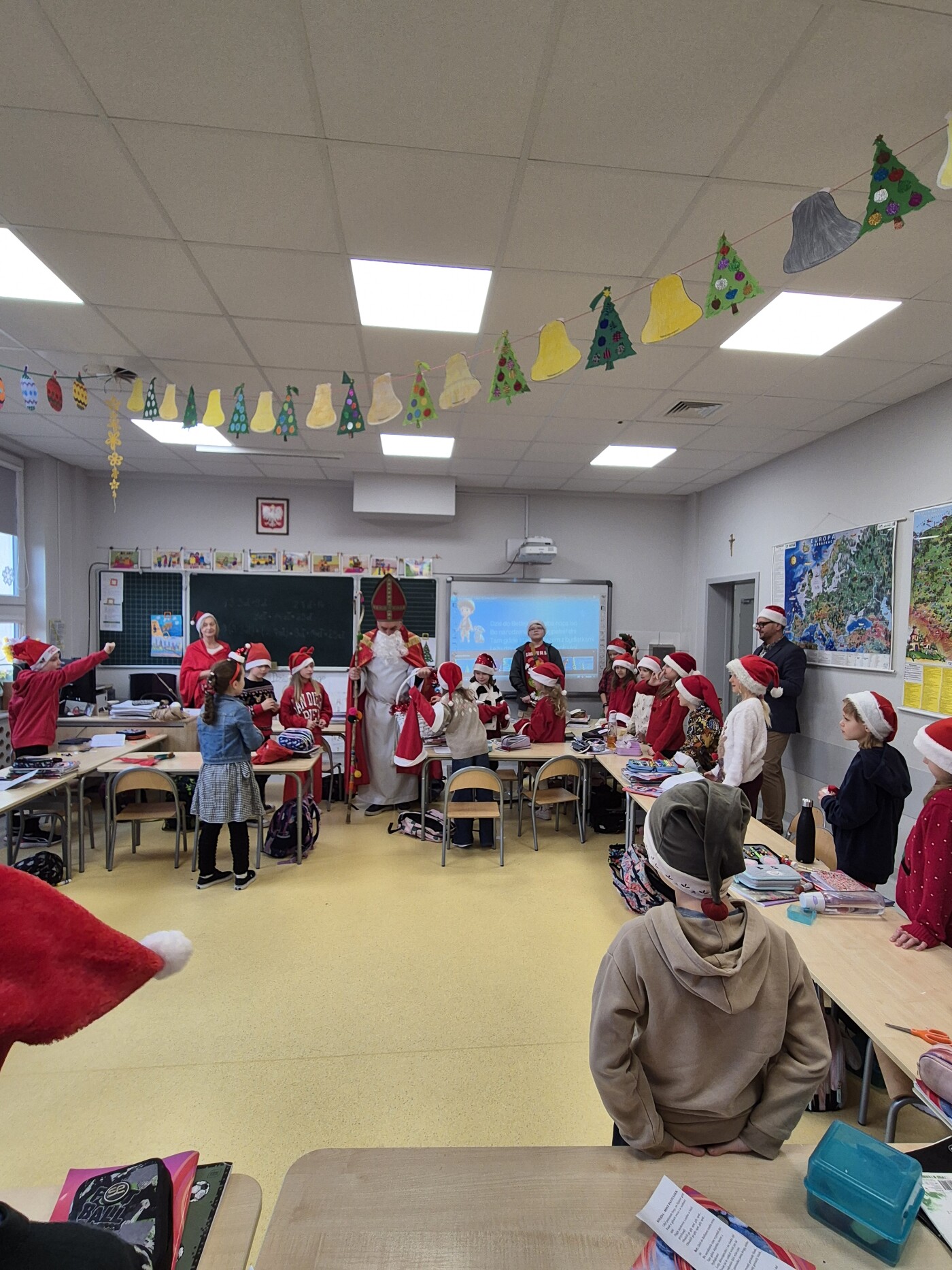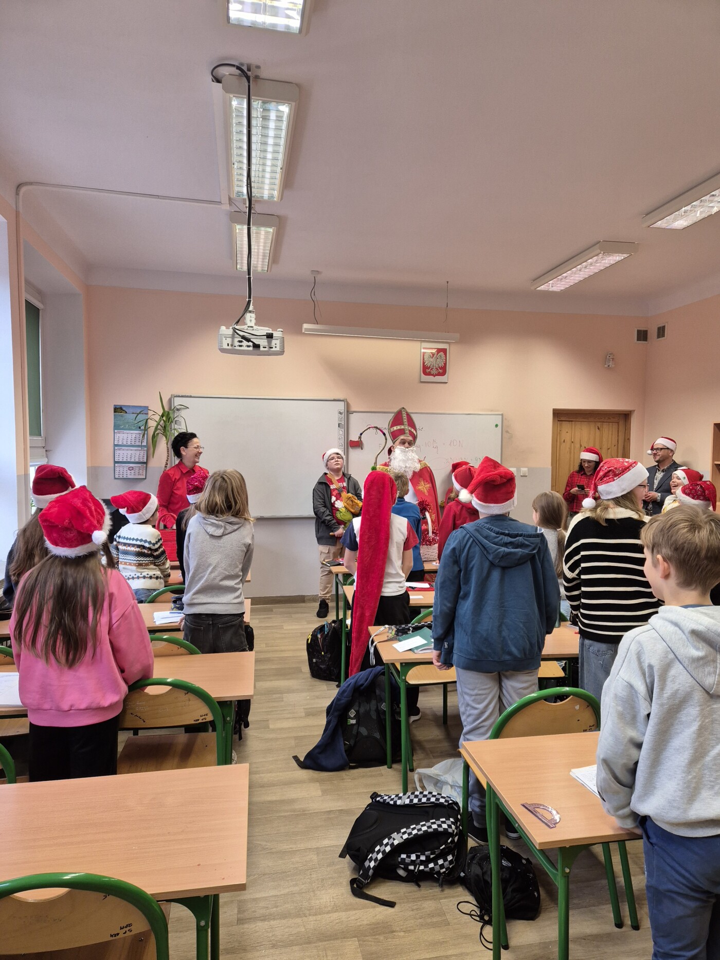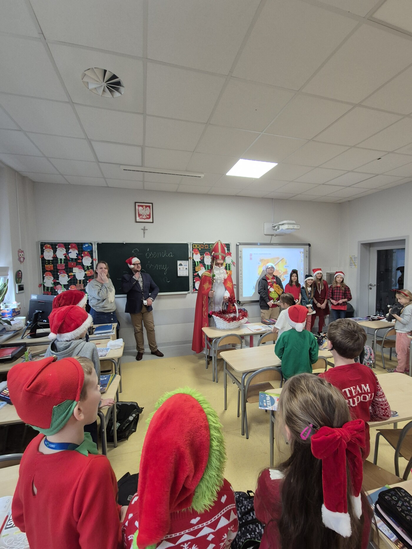 Mikołaj, niosąc ze sobą koszyk pełen słodkości, odwiedzał kolejno wszystkie klasy. Wchodził do pięknie udekorowanych sal, w których panował świąteczny nastrój, a dzieci z radością witały gościa. Każdy uczeń został poczęstowany cukierkiem, a następnie wszystkim złożono serdeczne życzenia wszelkiej pomyślności z okazji zbliżających się Świąt Bożego Narodzenia.