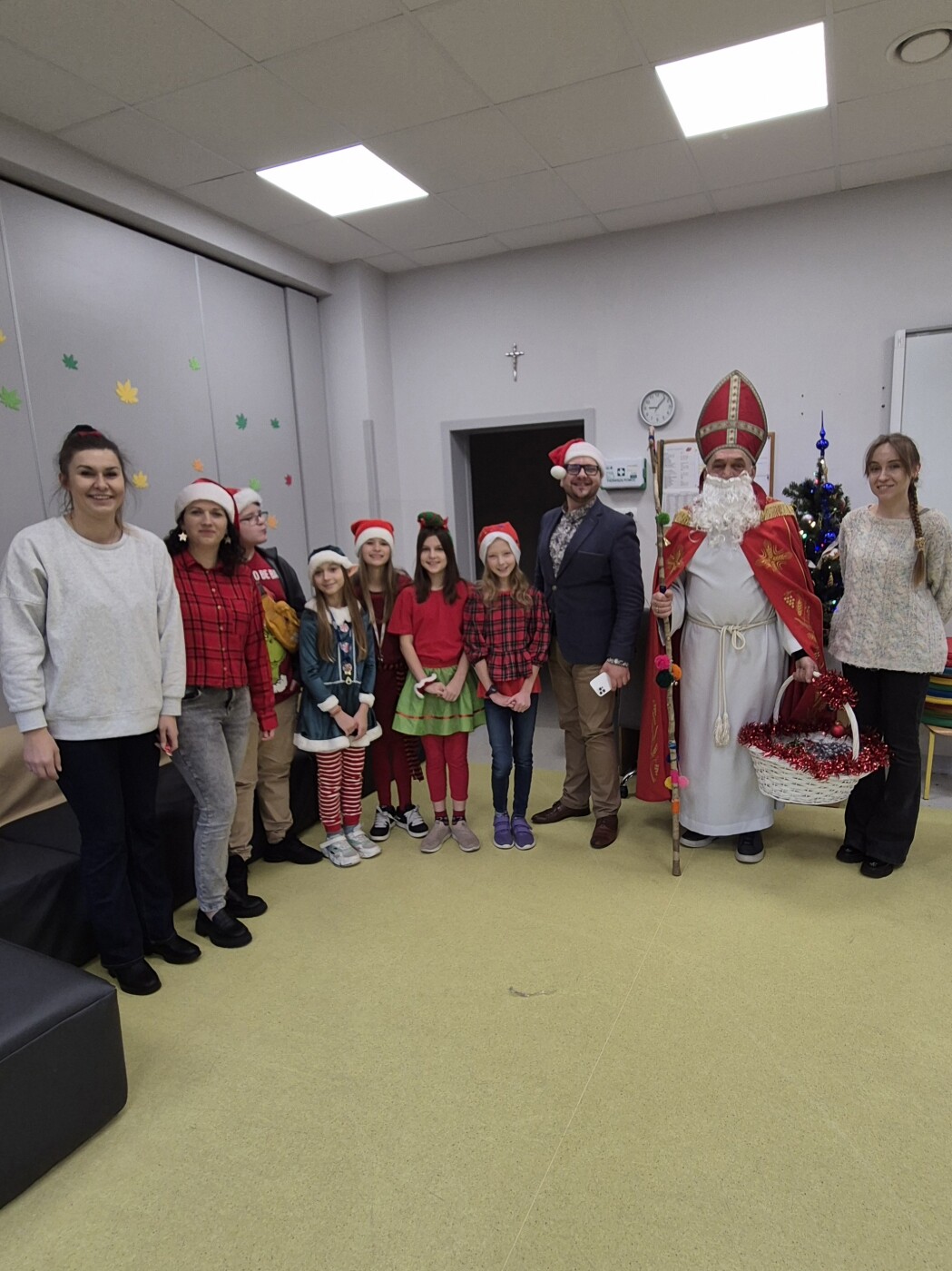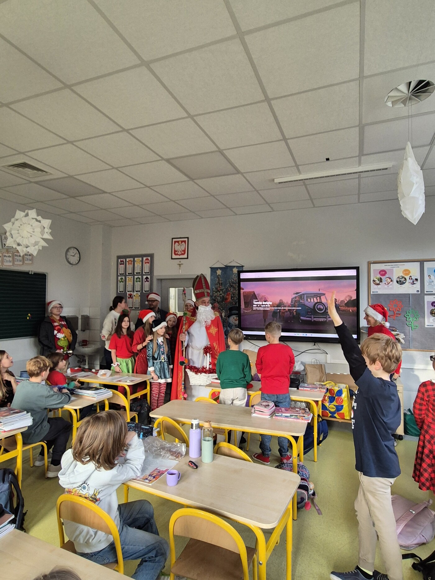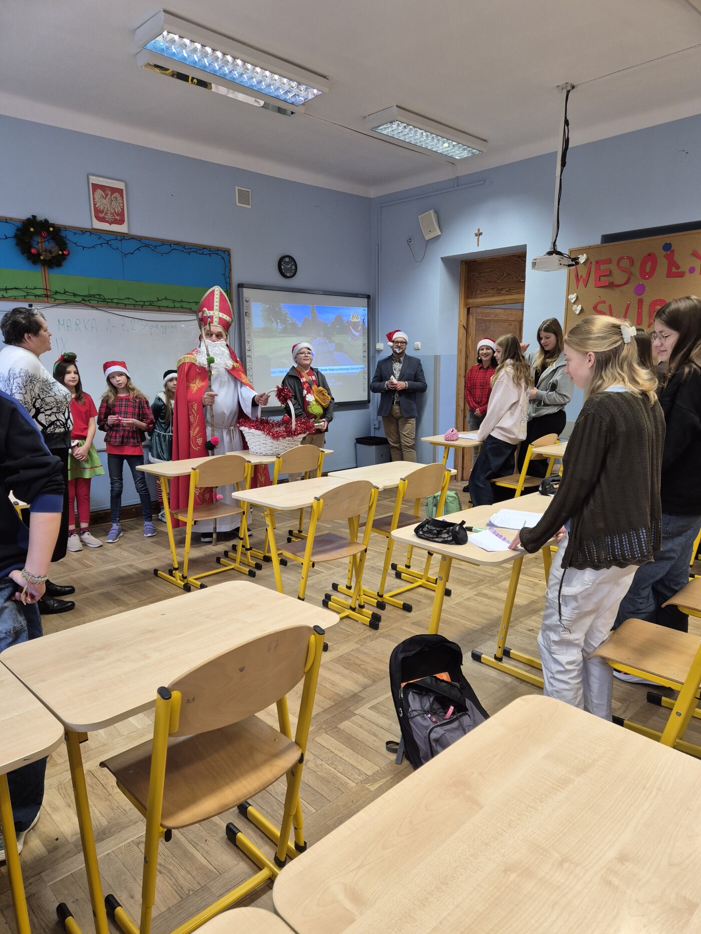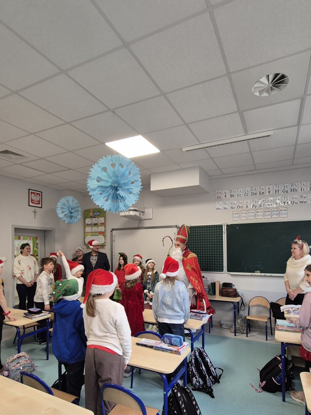 Mikołaj, niosąc ze sobą koszyk pełen słodkości, odwiedzał kolejno wszystkie klasy. Wchodził do pięknie udekorowanych sal, w których panował świąteczny nastrój, a dzieci z radością witały gościa. Każdy uczeń został poczęstowany cukierkiem, a następnie wszystkim złożono serdeczne życzenia wszelkiej pomyślności z okazji zbliżających się Świąt Bożego Narodzenia.